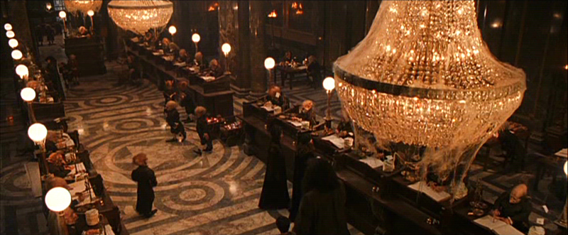 Pour l’instant, Gringotts n’a été visible que dans ES/f. C’est le hall d’entrée de l’ambassade d’Australie (Australia House) au bord du West End à Londres qui a servi de décor pour la grande salle.
